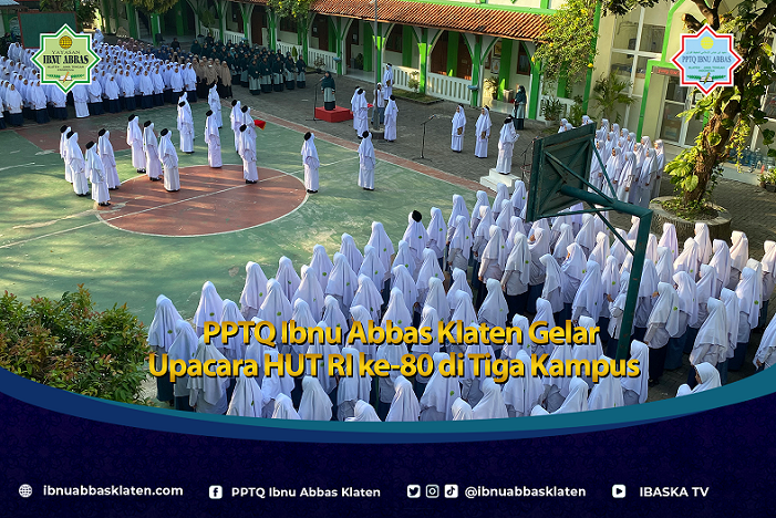 ibnuabbasklaten.com- Dalam rangka memperingati Hari Ulang Tahun ke-80 Kemerdekaan Republik Indonesia, Pondok Pesantren Tahfidzul Qur’an (PPTQ) Ibnu Abbas Klaten menyelenggarakan upacara bendera 17 Agustus 2025 di tiga lokasi berbeda, yakni Kampus 1 Putri Belangwetan, Kampus 2 Putra Troso, dan Kampus 3 KMI Jatinom.