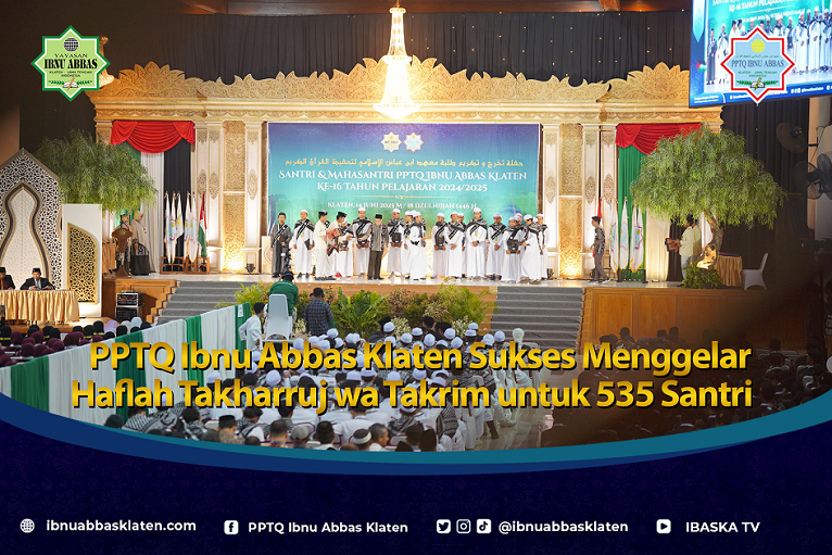 ibnuabbasklaten.com- Pondok Pesantren Tahfizhul Qur’an (PPTQ) Ibnu Abbas Klaten telah sukses menyelenggarakan Haflah Takharruj wa Takrim untuk 535 santri dan mahasantri yang berlangsung khidmat di Gedung W Wongso Menggolo, Sabtu, (14/6/2024)